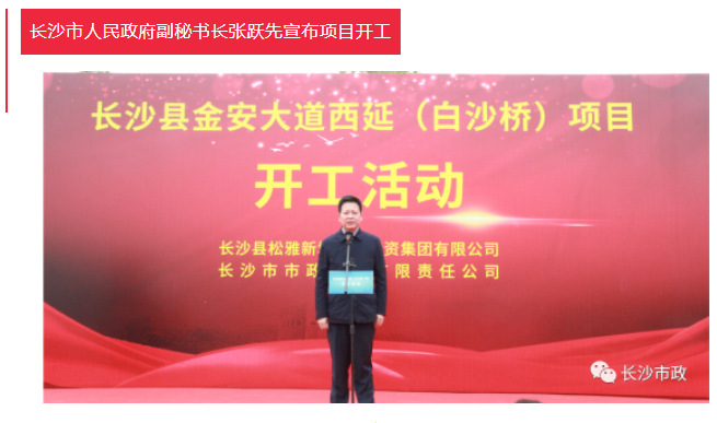 4月19日上午,長(zhǎng)沙縣金安大道(含白沙河橋)西延項(xiàng)目開(kāi)工活動(dòng)隆重舉行。長(zhǎng)沙市人民政府副秘書(shū)長(zhǎng)張躍先,長(zhǎng)沙縣委副書(shū)記、縣長(zhǎng)、松雅湖生態(tài)新城建設(shè)指揮部指揮長(zhǎng)陳永高,松雅湖生態(tài)新城建設(shè)指揮部常務(wù)副指揮長(zhǎng)曹偉興,長(zhǎng)沙市市政工程有限責(zé)任公司董事長(zhǎng)陳懷柏出席活動(dòng)。長(zhǎng)沙縣松雅湖生態(tài)新城發(fā)展中心書(shū)記羅衛(wèi)滋主持開(kāi)工活動(dòng)。
